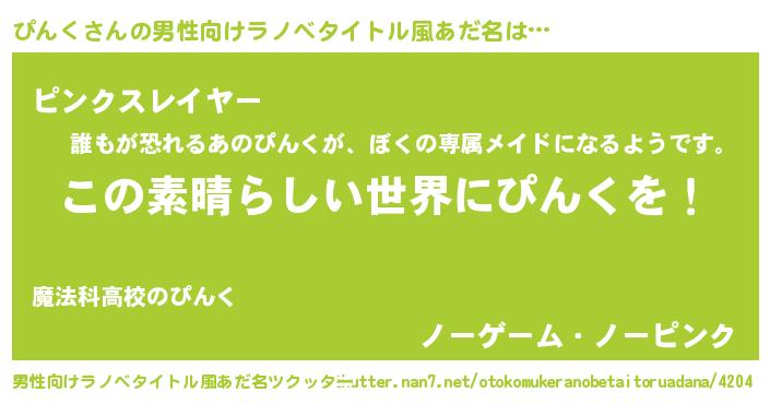 | 女子向けラノベタイトル風あだ名 | 『乙女ゲームの破滅フラグしかない悪役ぴんくに転生してしまった…』 |