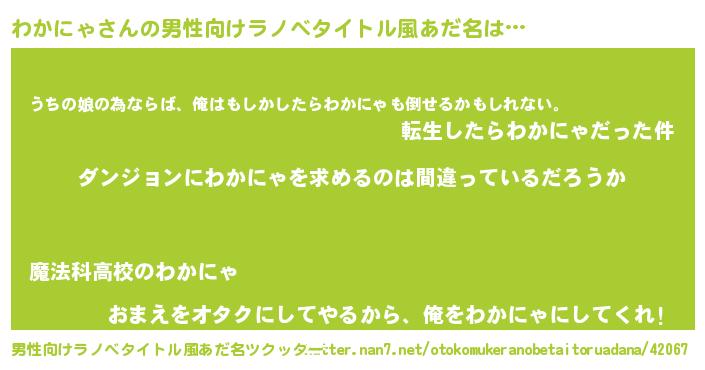 | 女子向けラノベタイトル風あだ名 | 『わかにゃの卵を拾いまして』 |