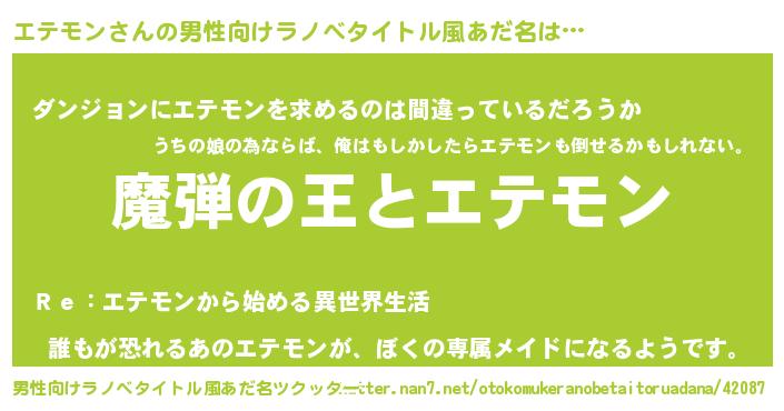 | 女子向けラノベタイトル風あだ名 | 『エテモンが死なない童話 林檎のエテモンの診療簿』 |