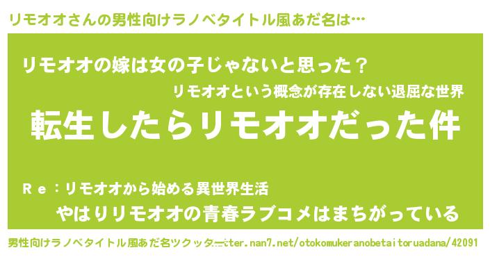 | 女子向けラノベタイトル風あだ名 | 『リモオオの玉の輿計画!』 |