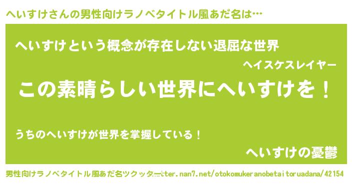| 女子向けラノベタイトル風あだ名 | 『乙女ゲームの破滅フラグしかない悪役へいすけに転生してしまった…』 |