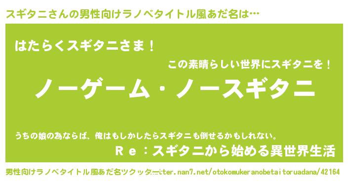 | 女子向けラノベタイトル風あだ名 | 『死神スギタニの再婚』『闇のスギタニ』 |