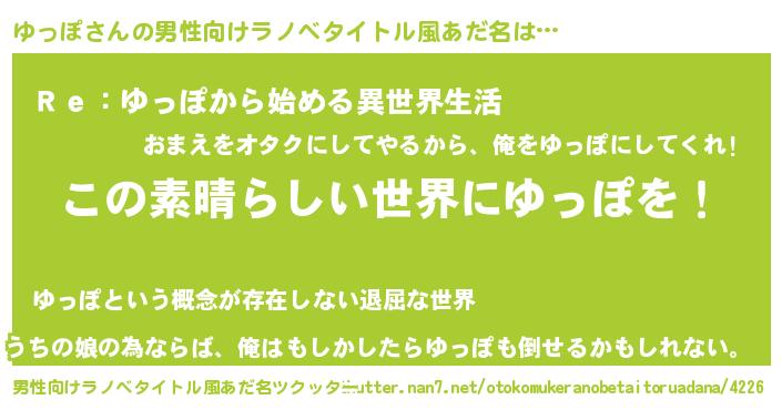 | 胡散臭い通販商品みたいなあだ名 | 『あなたにだけ特別に提供する限定10本のレアな日本酒…その名も「ゆっぽ」』 |