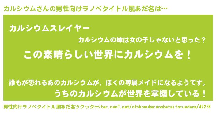 | 女子向けラノベタイトル風あだ名 | 『悪役カルシウムに転生したようですが、知った事ではありません』 |