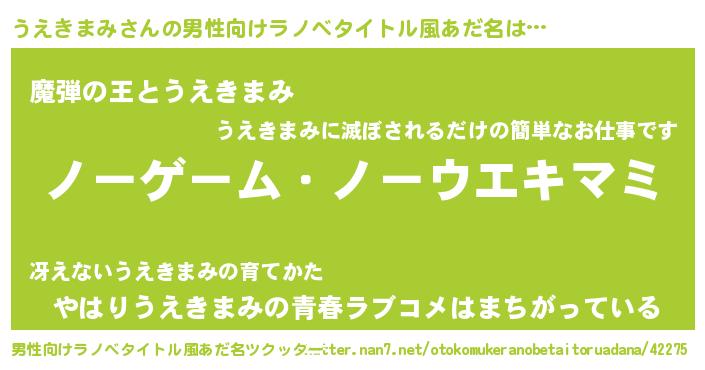 | 女子向けラノベタイトル風あだ名 | 『死神うえきまみの再婚』 |