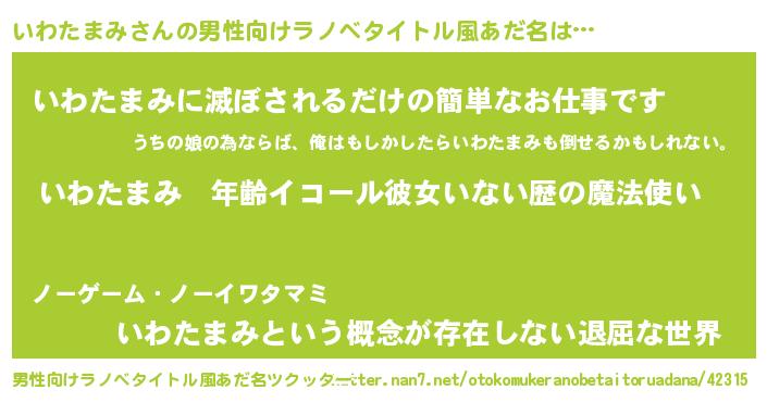 | 女子向けラノベタイトル風あだ名 | 『いわたまみの玉の輿計画!』 |