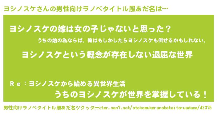 | 女子向けラノベタイトル風あだ名 | 『異世界で失敗しない100のヨシノスケ』 |