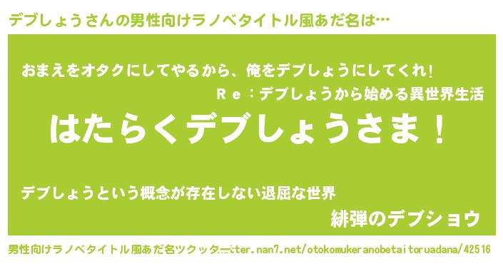 | 女子向けラノベタイトル風あだ名 | 『首の姫と首なしデブしょう』 |
