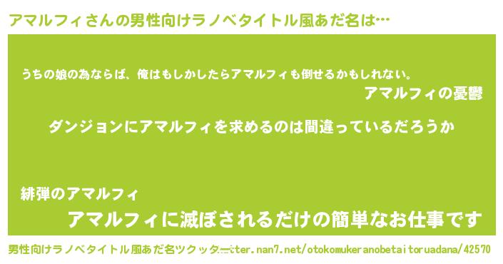 | 胡散臭い通販商品みたいなあだ名 | 『信頼と実績のサプリメント…その名も「アマルフィ」』 |