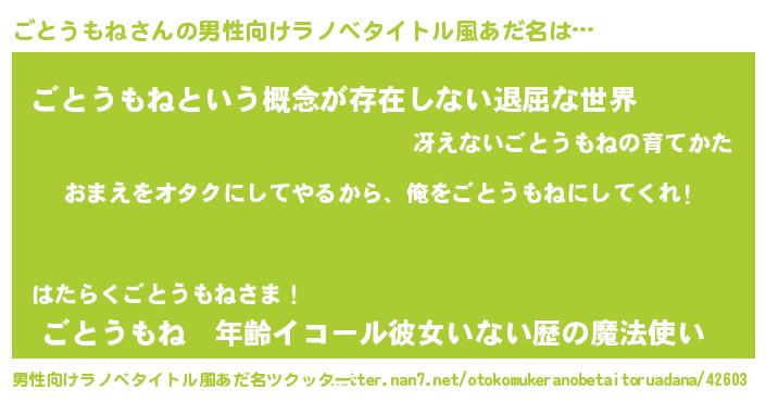 | 女子向けラノベタイトル風あだ名 | 『ごとうもね夫妻のなれそめ』 |