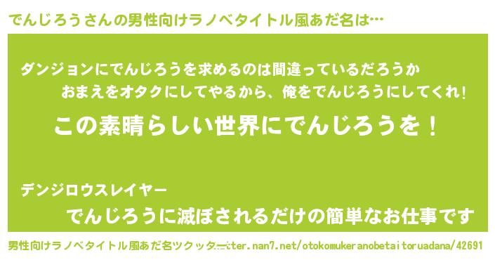 | 女子向けラノベタイトル風あだ名 | 『乙女ゲームの破滅フラグしかない悪役でんじろうに転生してしまった…』 |