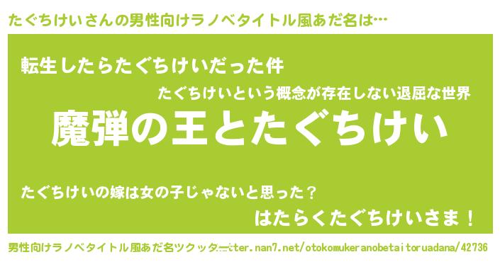 | 女子向けラノベタイトル風あだ名 | 『たぐちけいが死なない童話 林檎のたぐちけいの診療簿』 |