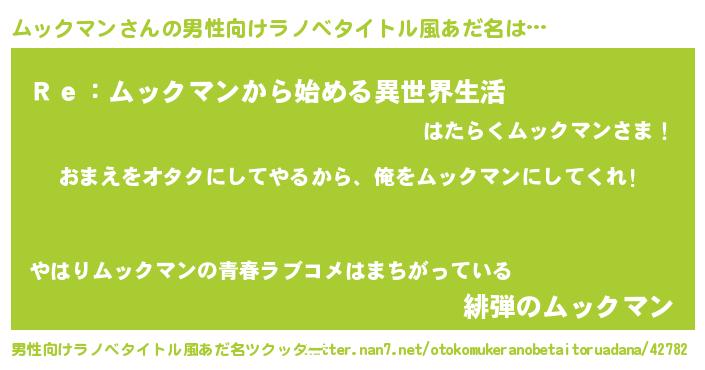 | 女子向けラノベタイトル風あだ名 | 『ムックマン夫妻のなれそめ』 |