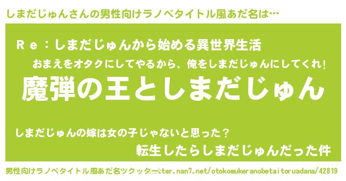 | 女子向けラノベタイトル風あだ名 | 『乙女ゲームの破滅フラグしかない悪役しまだじゅんに転生してしまった…』 |