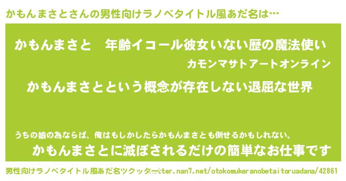 | 女子向けラノベタイトル風あだ名 | 『かもんまさとの契約王妃』 |