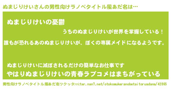 | 女子向けラノベタイトル風あだ名 | 『異世界でカフェぬまじりけいを開店しました。』 |