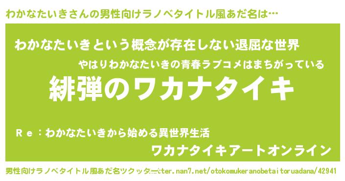 | 胡散臭い通販商品みたいなあだ名 | 『絶対に幸福をもたらす健康食品…その名も「わかなたいき」』 |