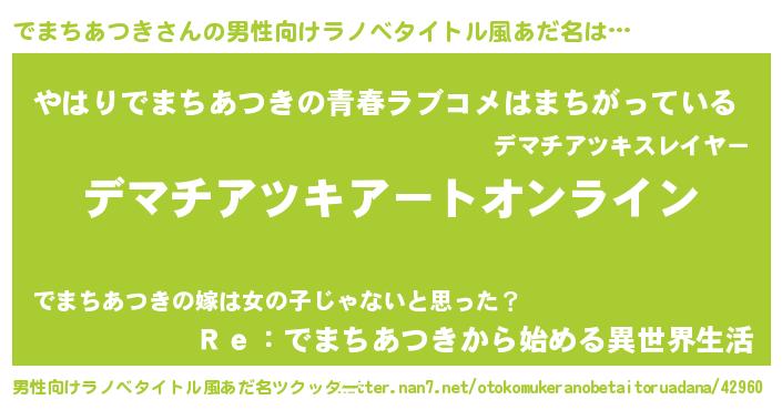 | 女子向けラノベタイトル風あだ名 | 『誰かこのでまちあつきを説明してください! ~契約から始まるウェディング~』 |