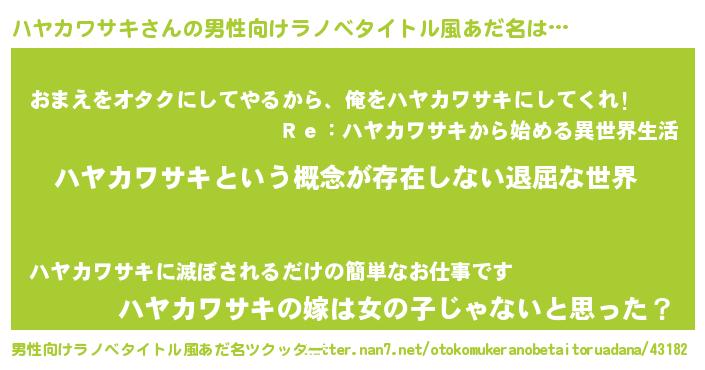 | 女子向けラノベタイトル風あだ名 | 『異世界で失敗しない100のハヤカワサキ』 |