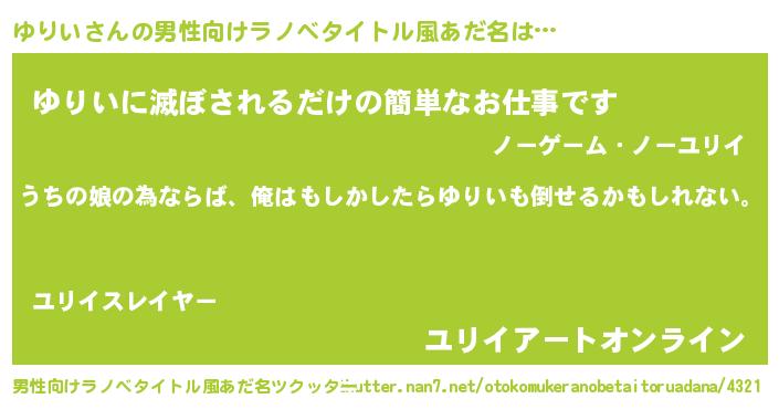 | 女子向けラノベタイトル風あだ名 | 『ゆりい伯爵の花嫁』『死神ゆりいの再婚』 |