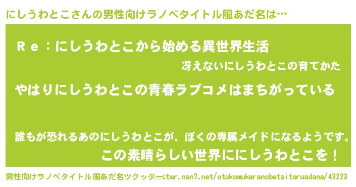 | 女子向けラノベタイトル風あだ名 | 『にしうわとこの雑貨屋さん』 |