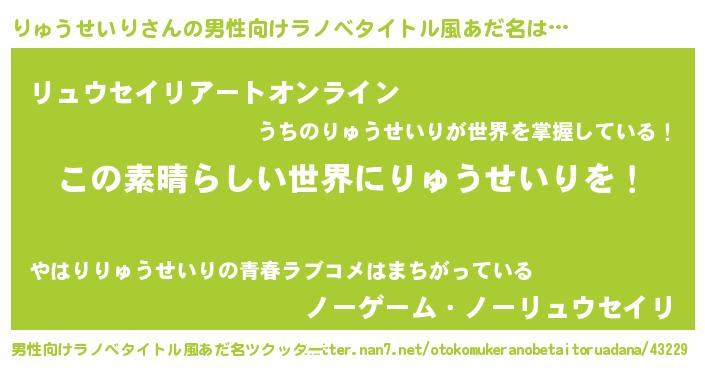 | 女子向けラノベタイトル風あだ名 | 『悪役りゅうせいりに転生したようですが、知った事ではありません』 |