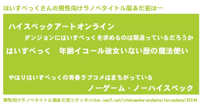| 女子向けラノベタイトル風あだ名 | 『はいすぺっくの玉の輿計画!』 |
