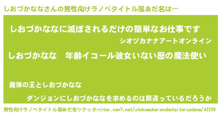 | 女子向けラノベタイトル風あだ名 | 『しおづかななの玉の輿計画!』 |