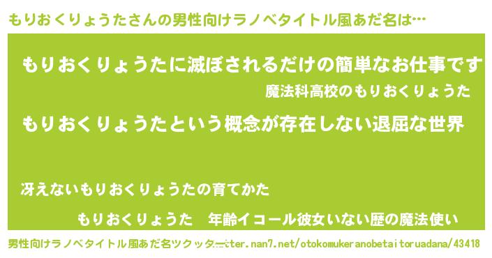 | 女子向けラノベタイトル風あだ名 | 『異世界で失敗しない100のもりおくりょうた』 |