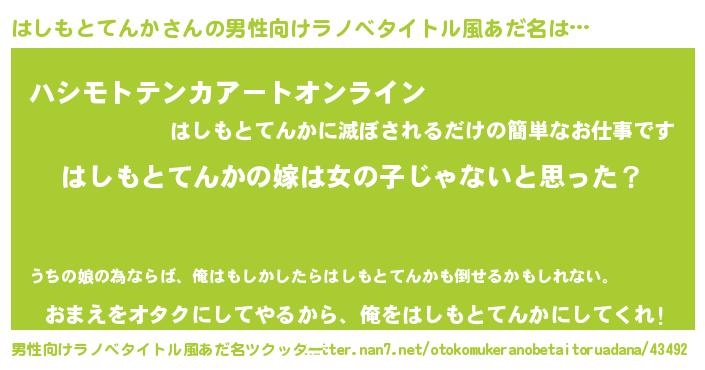 | 女子向けラノベタイトル風あだ名 | 『はしもとてんかの卵を拾いまして』 |