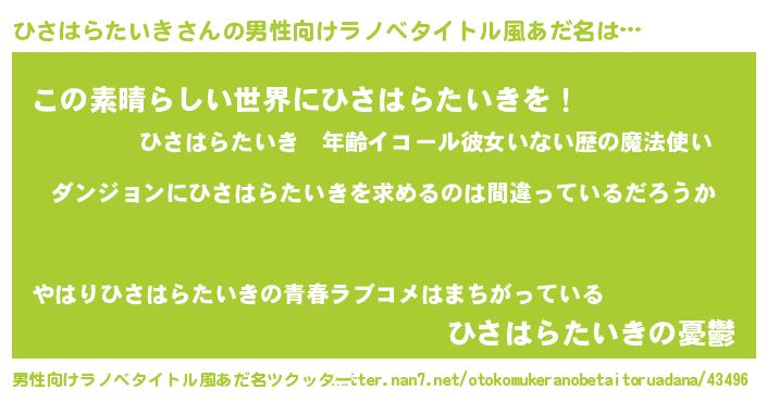 | 胡散臭い通販商品みたいなあだ名 | 『信頼と実績のサプリメント…その名も「ひさはらたいき」』 |
