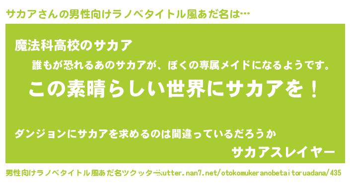 | 胡散臭い通販商品みたいなあだ名 | 『あなたにだけ特別に提供する100年もののヴィンテージワイン…その名も「サカア」』 |