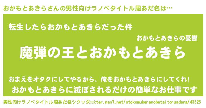 | 女子向けラノベタイトル風あだ名 | 『乙女ゲームの破滅フラグしかない悪役おかもとあきらに転生してしまった…』 |