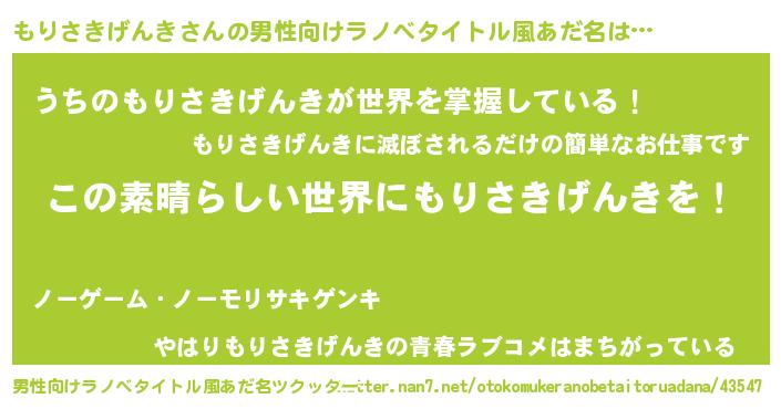 | 女子向けラノベタイトル風あだ名 | 『悪役もりさきげんきに転生したようですが、知った事ではありません』 |