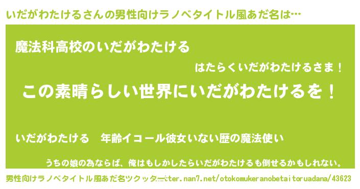 | 意味不明あだ名 | 『住所不定無職いだがわたける(59歳)』 |