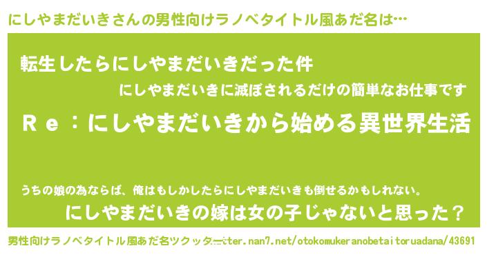 | 女子向けラノベタイトル風あだ名 | 『にしやまだいきストレイドッグス』 |