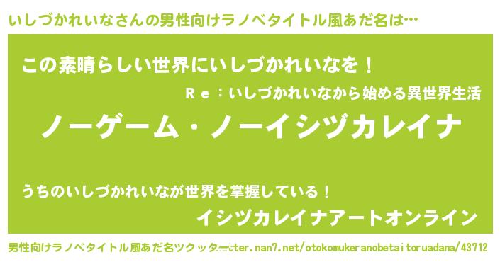 | 女子向けラノベタイトル風あだ名 | 『死神いしづかれいなの再婚』 |