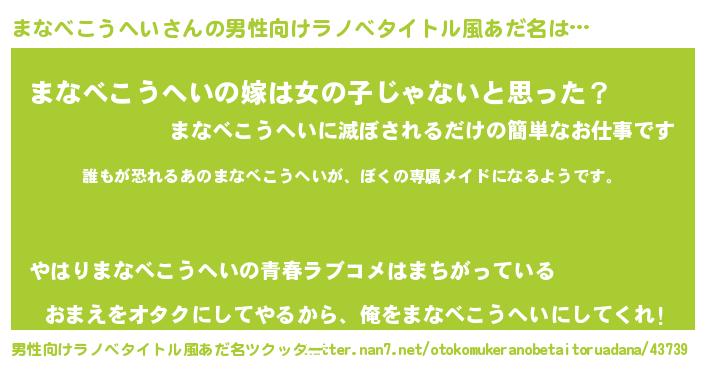 | 女子向けラノベタイトル風あだ名 | 『まなべこうへいの契約王妃』 |