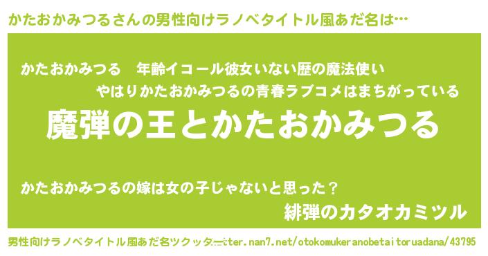 | 女子向けラノベタイトル風あだ名 | 『かたおかみつるが死なない童話 林檎のかたおかみつるの診療簿』 |