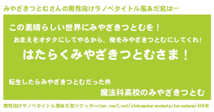 | ヘコむあだ名 | 『みやざきつとむ(遠い目)』『みやふぇ~』 |