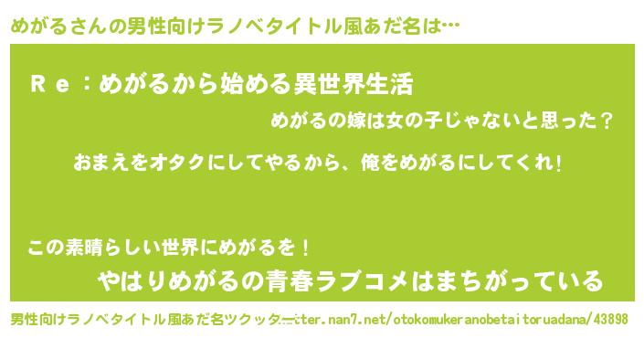 | 女子向けラノベタイトル風あだ名 | 『めがる夫妻のなれそめ』 |
