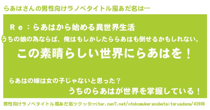 | 女子向けラノベタイトル風あだ名 | 『悪役らあはに転生したようですが、知った事ではありません』 |