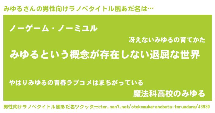 | 女子向けラノベタイトル風あだ名 | 『異世界で失敗しない100のみゆる』 |