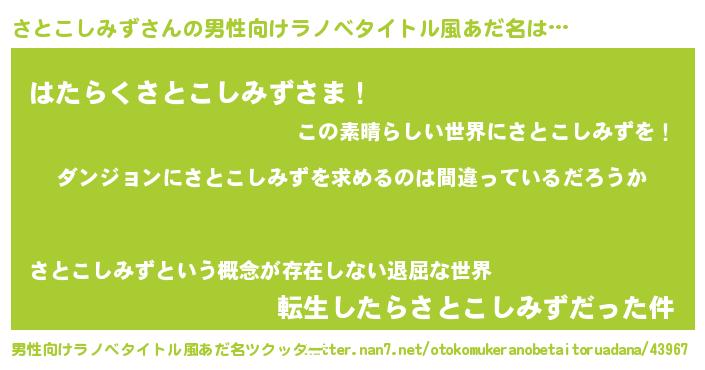 | 女子向けラノベタイトル風あだ名 | 『さとこしみずの卵を拾いまして』 |