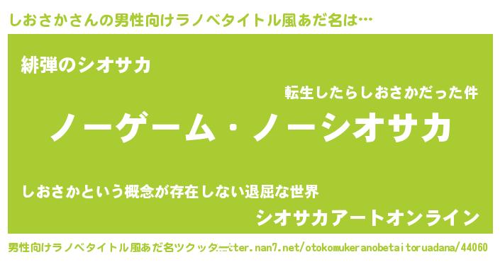 | ヒーロー風カッコイイあだ名 | 『慈愛の使者しおさか』『ネオシオサカ』 |