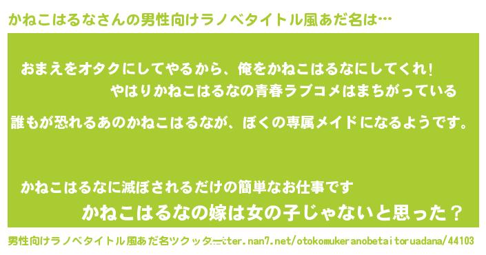 | 胡散臭い通販商品みたいなあだ名 | 『来世でも幸せになれる水素水…その名も「かねこはるな」』 |