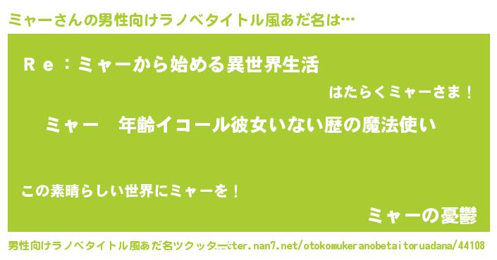 | 女子向けラノベタイトル風あだ名 | 『ミャーの玉の輿計画!』 |