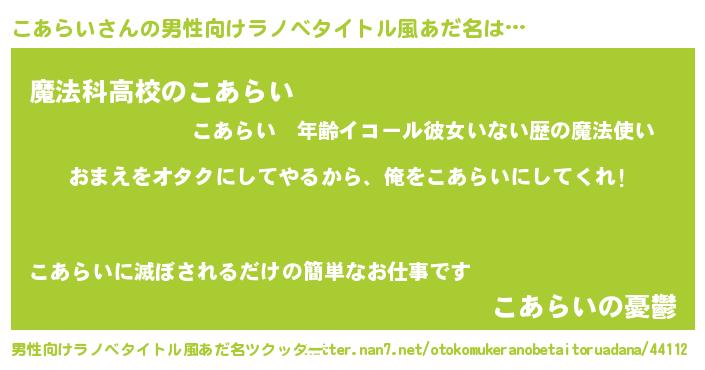 | 女子向けラノベタイトル風あだ名 | 『こあらい夫妻のなれそめ』 |