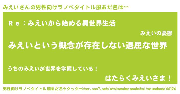 | 女子向けラノベタイトル風あだ名 | 『異世界で失敗しない100のみえい』 |