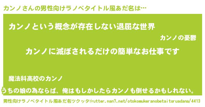 | 胡散臭い通販商品みたいなあだ名 | 『来世でも幸せになれる健康食品…その名も「カンノ」』 |